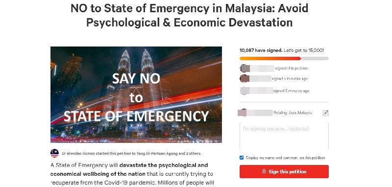 有关标题为《禁止马来西亚进入紧急状态:避免造成心理和经济破坏》的网上请愿运动,在截至今晚10时10分,已获得超过1万人签署。