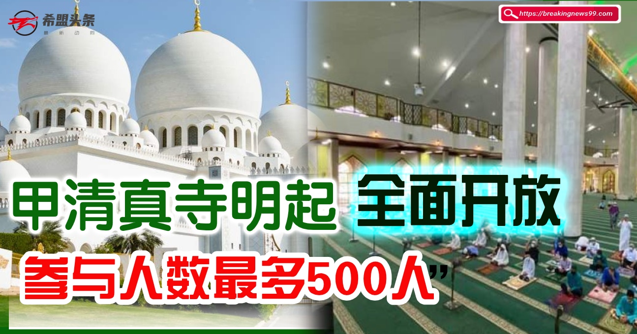 马六甲州政府今日(27日)发文告说,允许甲州清真寺从明日起进行祈祷仪式,参与人数限制于最多500人!