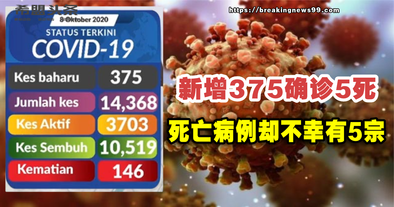 大马单日新增2019冠病例继续下降至375宗,但新增死亡病例却不幸有5宗,而且都来自沙巴。另外新添5个感染簇群。